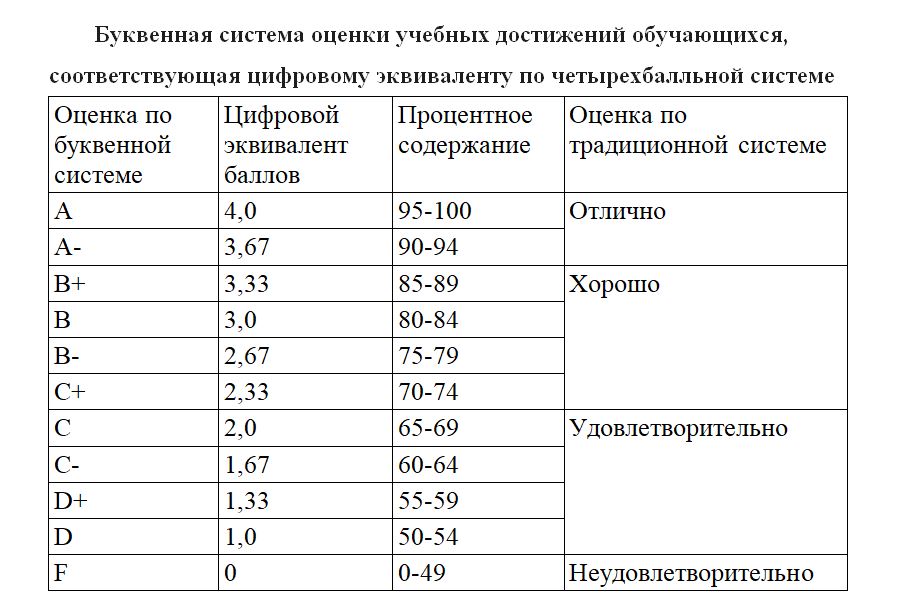 Буквенная система оценки учебных достижений обучающихся, соответствующая цифровому эквиваленту по четырёхбалльной системе.