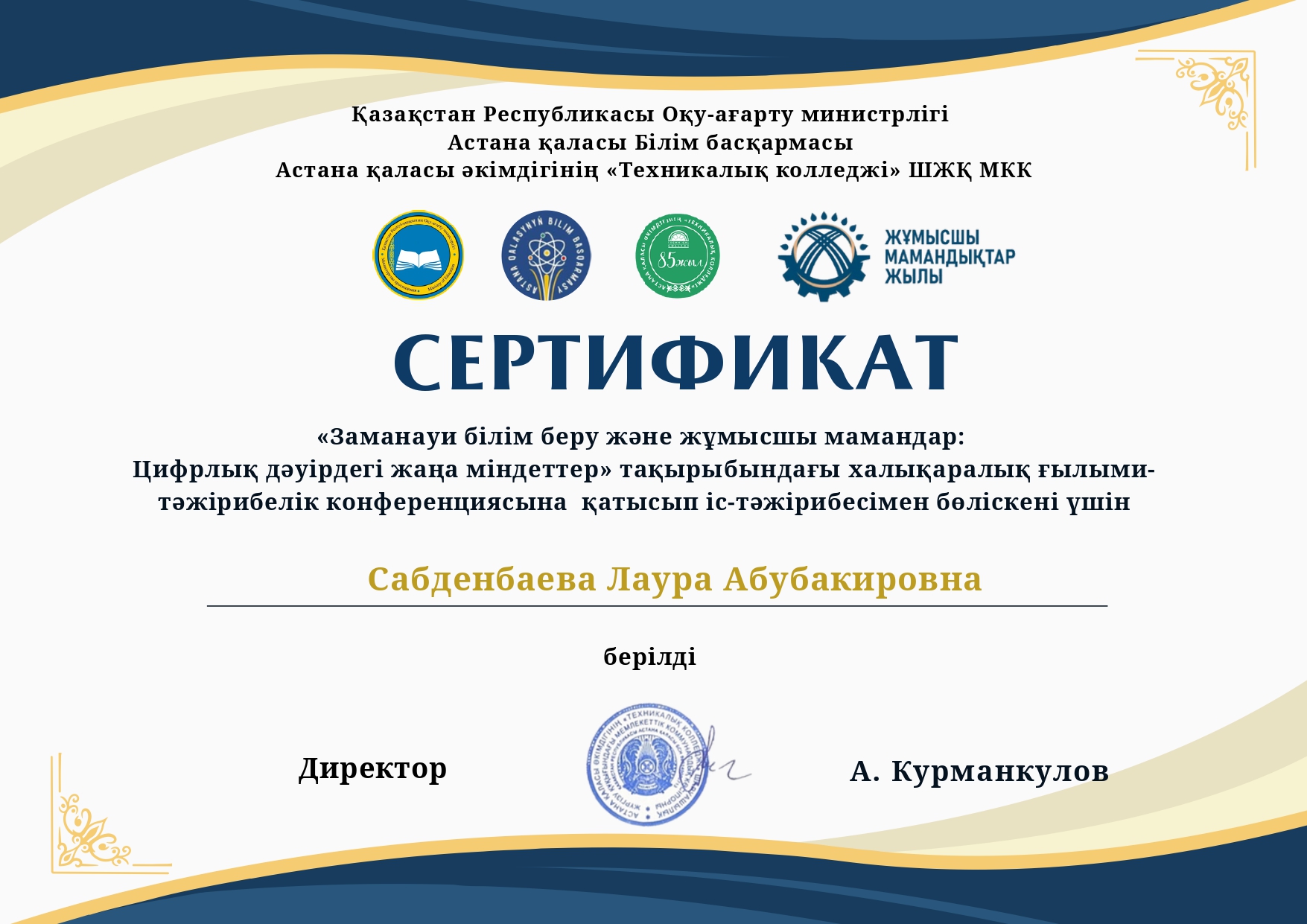 Сертификаты за обмен опытом и участие в международной научно-практической конференции на тему «Современное образование и работающие специалисты: новые вызовы цифровой эпохи»