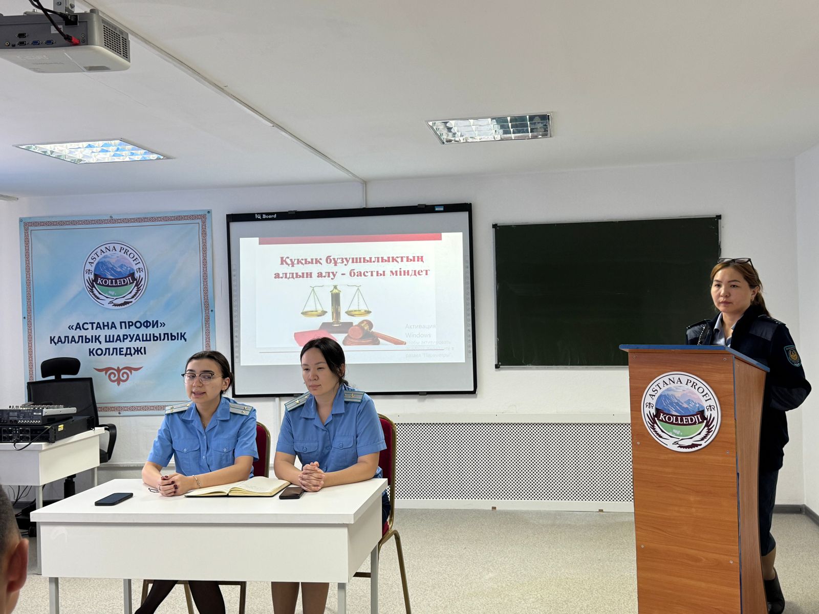 "Адал азамат" біртұтас тәрбие бағдарламасы аясында колледжде Астана қаласы Сарыарқа ауданының прокуратурасы,бөлім прокурорлары Махмутова Аружан Дәулетқызы, Жұмабаева Алия Уразкуловна және колледж инспекторы Боранова Құндыз Жұмабайқызының қатысуымен"Заң және тәртіп:құқық бұзушылықтың алдын алу" тақырыбында түсіндірме жұмыстары өтті.