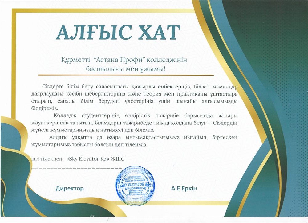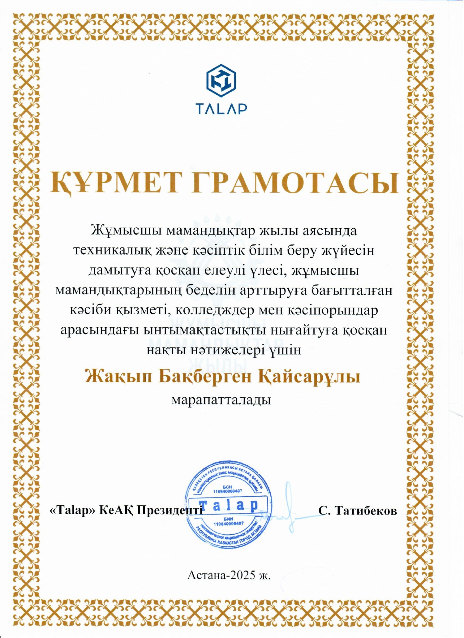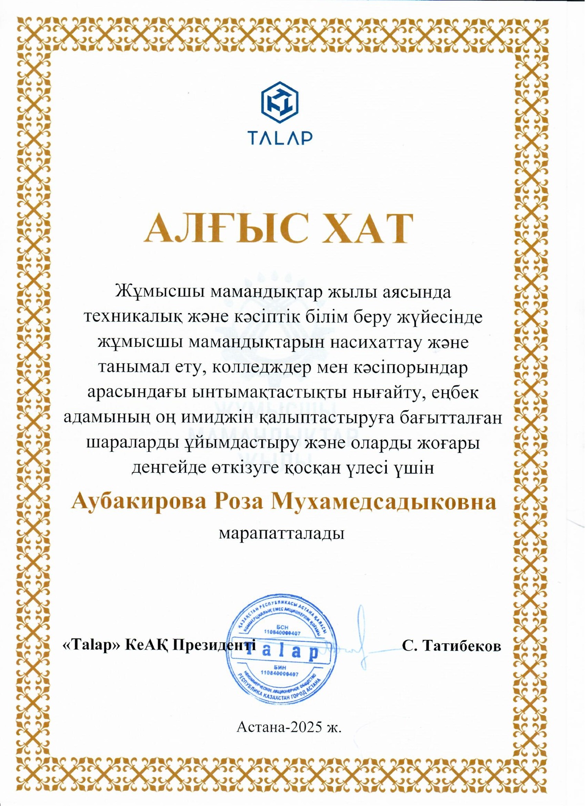 Преподаватели колледжа получили благодарственное письмо от имени Президента НАО «Talap» в связи с завершением «Года рабочих профессий»